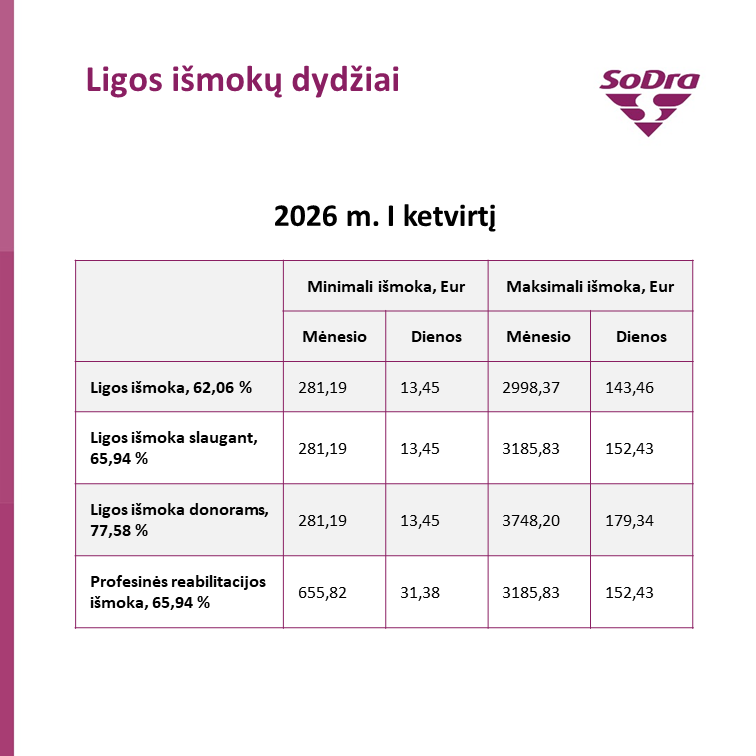 Šie dydžiai priklauso nuo vidutinio darbo užmokesčio šalyje ir kiekvieną ketvirtį yra perskaičiuojami. Kadangi VDU kas ketvirtį pasikeičia, keičiasi ir išmokų ribos. Pirmojo 2026 metų ketvirčio ligos išmokos bus apskaičiuojamos taikant 2 415,70 euro VDU dydį, kuris galiojo trečiąjį 2025 m. ketvirtį.