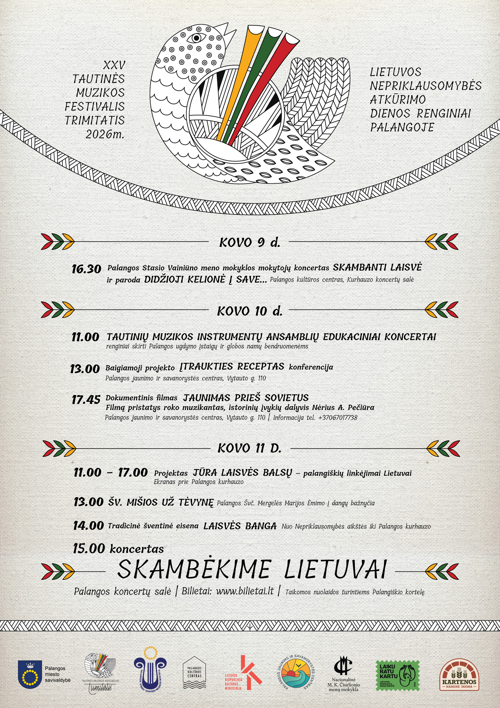 Kovo 10-ąją tautinių muzikos instrumentų ansambliai koncertuos Palangos ugdymo įstaigose ir globos namuose – muzika pasieks mokyklų bei bendruomenių erdves. Tą pačią dieną Palangos jaunimo ir savanorystės centre vyks projekto „Įtraukties receptas“ baigiamoji konferencija, o 17.45 val. bus rodomas dokumentinis filmas „Jaunimas prieš sovietus“, kurį pristatys jo autorius Nėrius A. Pečiūra.