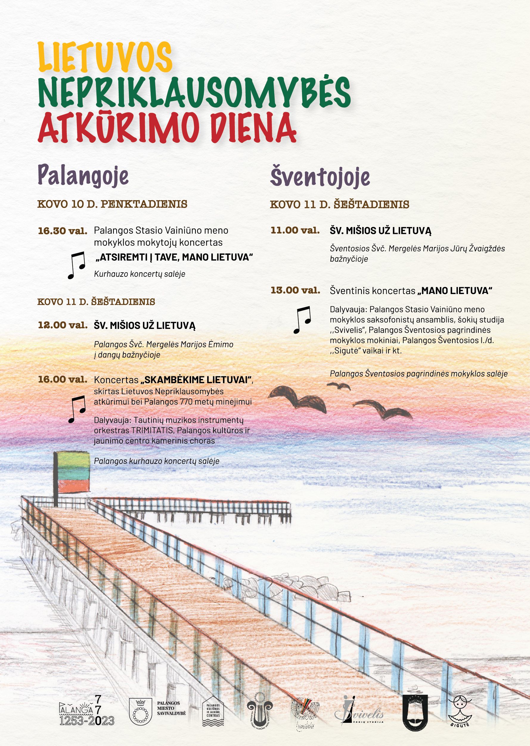 Kovo 10 d. 16.30 val. Palangos kurhauzo koncertų salėje skambės šventinis Palangos Stasio Vainiūno meno mokyklos mokytojų koncertas „Atsiremti į Tave, mano Lietuva“. Kovo 11 d. 13 val. visi laukiami Šventosios pagrindinės mokyklos salėje, kurioje džiugins jungtinis įvairių jaunimo kolektyvų koncertas „Mano Lietuva“. Jame dalyvauja Palangos Stasio Vainiūno meno mokyklos saksofonistų ansamblis, šokių studija „Svivelis“, Palangos Šventosios pagrindinės mokyklos mokiniai, Palangos Šventosios l./d. „Sigutė“ vaikai ir kiti. Po pietų 16 val. pagrindiniame