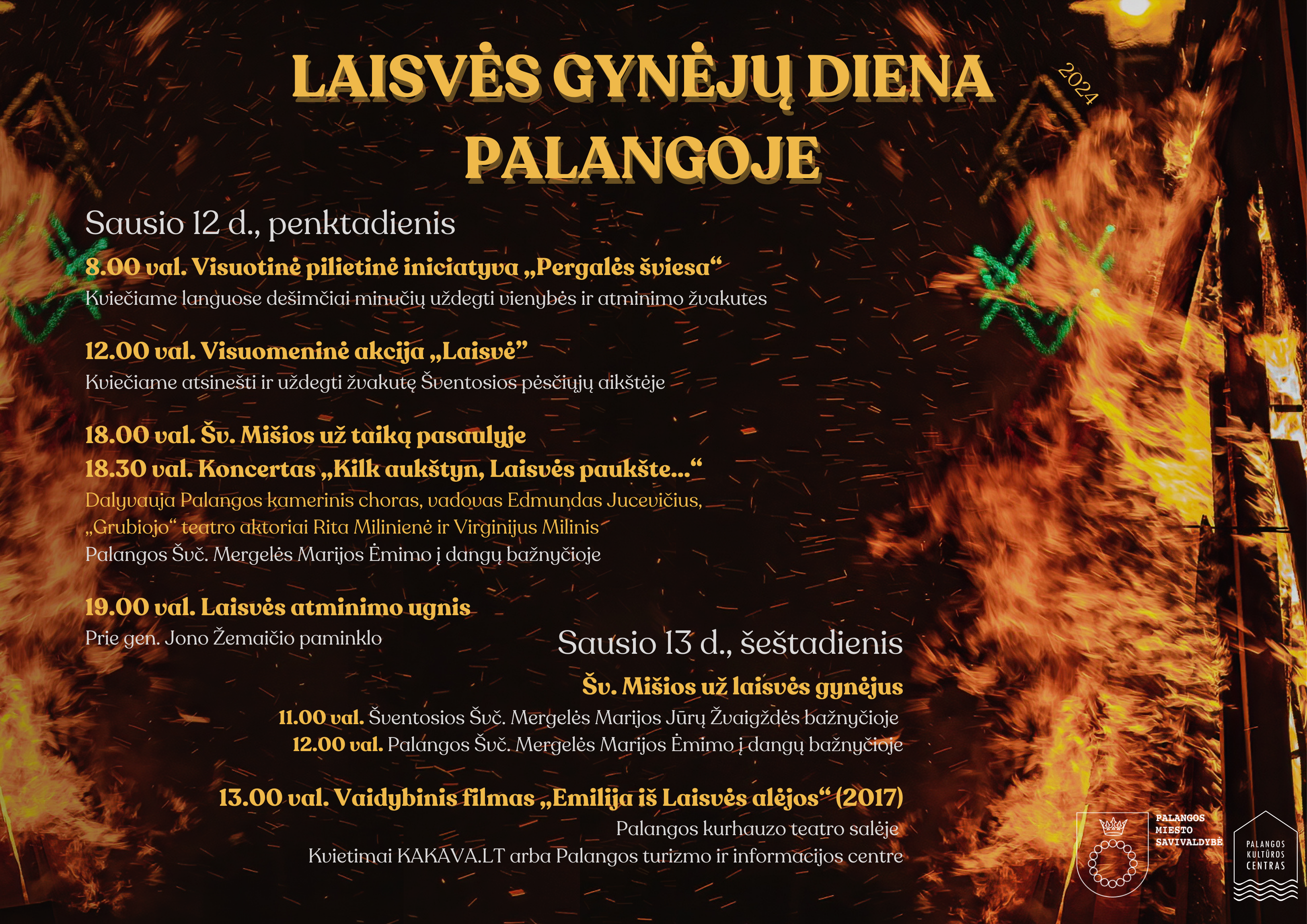 Sausio 13-osios rytas prasidės Šv. Mišiomis už laisvės gynėjus Šventosios Švč. Mergelės Marijos Jūrų Žvaigždės bažnyčioje 11 val. Palangos Švč. Mergelės Marijos Ėmimo į dangų bažnyčioje Šv. Mišios taip pat bus aukojamos 12 val. Po pietų 13 val. vyks vaidybinio filmo „Emilija iš Laisvės alėjos“ (rež. Donatas Ulvydas) peržiūra Palangos kurhauzo teatro salėje. Kvietimus į filmo peržiūrą galima rezervuoti internetu kakava.lt arba Palangos turizmo ir informacijos centre.