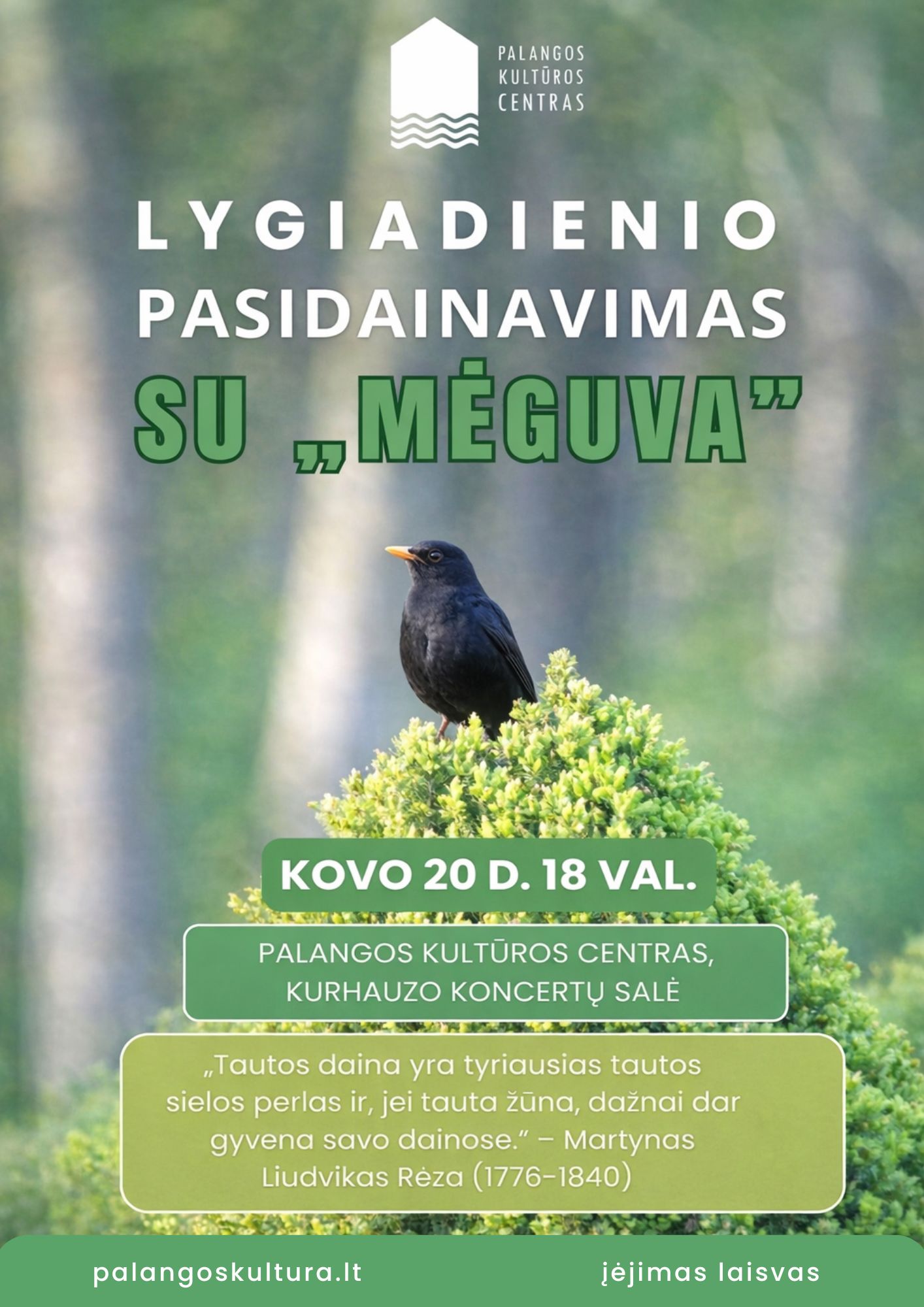 Artėjant pavasario lygiadieniui kviečiame susiburti į jaukų bendro dainavimo vakarą. Dainuosime pavasarines dainas – apie paukščius, bundantį mišką, meilę ir sugrįžtantį pavasarį. Skambės dainos iš Martyno Liudviko Rėzos dainyno, taip pat mūsų krašte ir kituose Lietuvos regionuose užrašytos liaudies dainos.