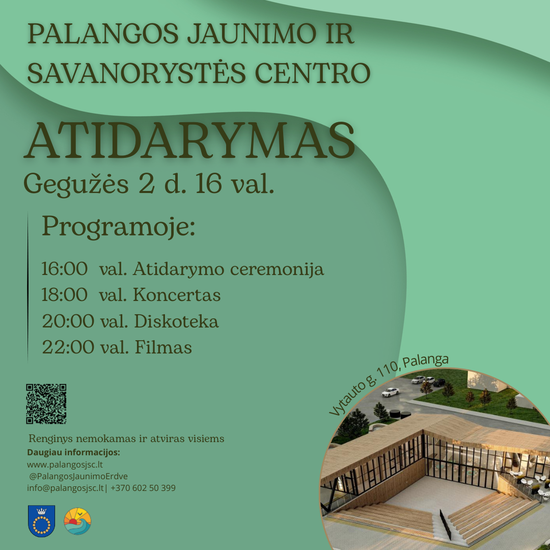 Gegužės 2 d. 16 val. palangiškiai ir kurorto svečiai kviečiami drauge paminėti ypatingą įvykį – naujojo Palangos jaunimo ir savanorystės centro pastato (Vytauto g. 110, Palanga ) atidarymą.