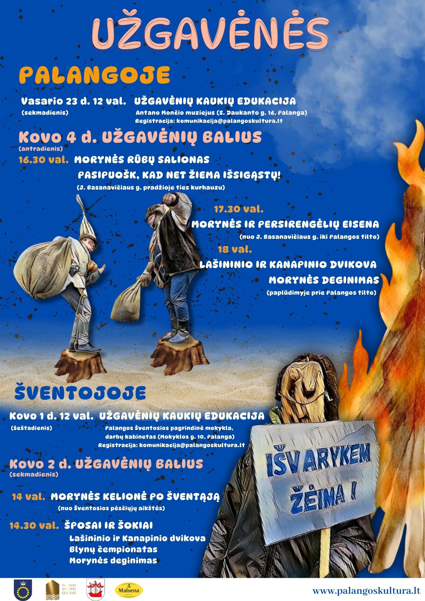 Kovo 2 d. Šventosios pėsčiųjų aikštėje nusimato smagūs šposai ir šokiai! Užgavėnių dalyviai kviečiami atsinešt gardžiausius, įdomiausių formų ar spalvų, didžiausius ir mažiausius blynus. Kompetentinga komisija išrinks labiausiai nusipelniusius ir apdovanos rėmėjų „Malsena“ prizais.