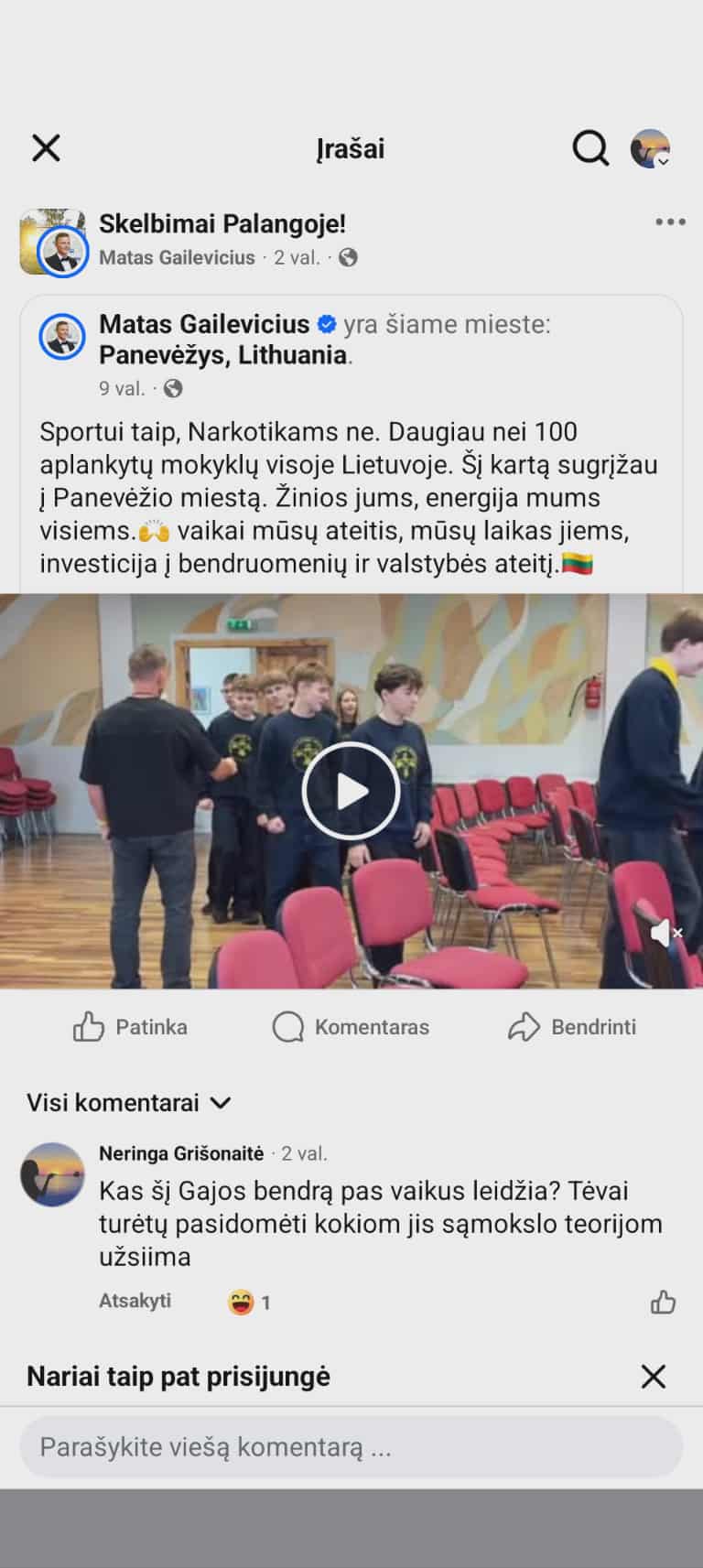 Viena jų, verslininkė Neringa Grišonaitė, pastebėjusi, kad Matas Gailevičius aktyviai dalijasi vaikų vaizdo įrašais įvairiose, su vaikais ir Palanga niekaip nesusijusiose grupėse „Facebook“, pasidalino savo pastebėjimu su kitais vienoje Palangai skirtoje „Facebook“ grupėje: „Pamačiusi tai, suabejojau jo veiklos skaidrumu. Prisidengdamas švietėjiška veikla, jis, regis, naudojasi vaikais savo žinomumui didinti – kaip politinis veikėjas arba kaip verslininkas,“ – įsitikinusi palangiškė.