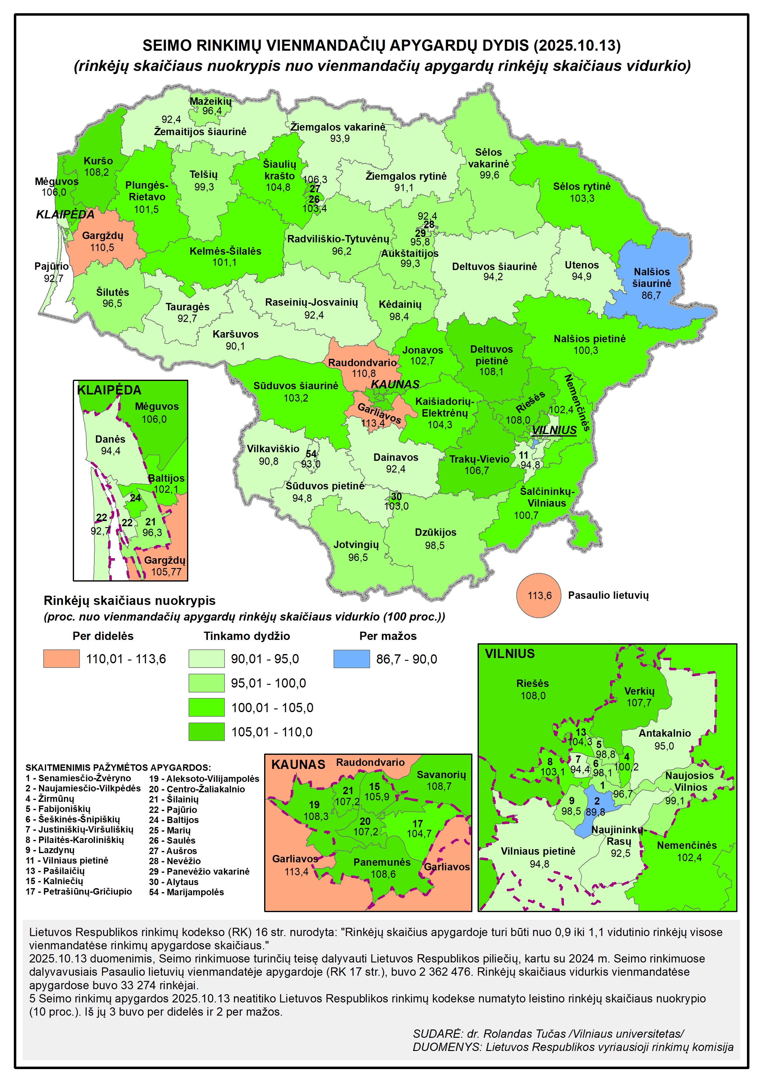 Duomenų analizė parodė, kad praėjus vieneriems metams nuo 2024 metų spalį vykusių Seimo rinkimų, atsirado net penkios vienmandatės apygardos (į šį skaičių neįtraukiant Pasaulio lietuvių vienmandatės rinkimų apygardos – jos sudarymui Rinkimų kodekse nustatyta kita tvarka), kurios išeina iš Rinkimų kodekse nustatytos leistinos 10 proc. rinkėjų nuokrypio ribos skaičiuojant nuo vidutinio rinkėjų visose vienmandatėse rinkimų apygardose skaičiaus (33 274).